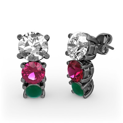 Pırlanta, rodolit garnet ve kök zümrüt 925 ayar siyah rodyum kaplama gümüş küpe (1 karat)