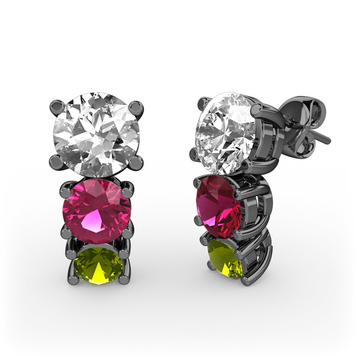 Pırlanta, rodolit garnet ve peridot 925 ayar siyah rodyum kaplama gümüş küpe (1 karat)