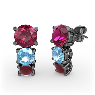 Rodolit garnet, akuamarin ve kök yakut 925 ayar siyah rodyum kaplama gümüş küpe