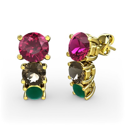Rodolit garnet, dumanlı kuvars ve kök zümrüt 925 ayar altın kaplama gümüş küpe