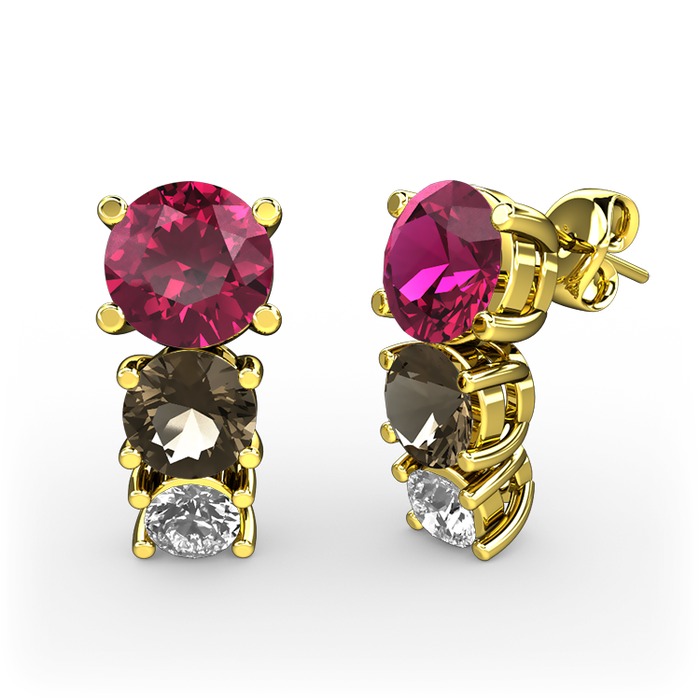 Rodolit garnet, dumanlı kuvars ve swarovski 8 ayar altın küpe