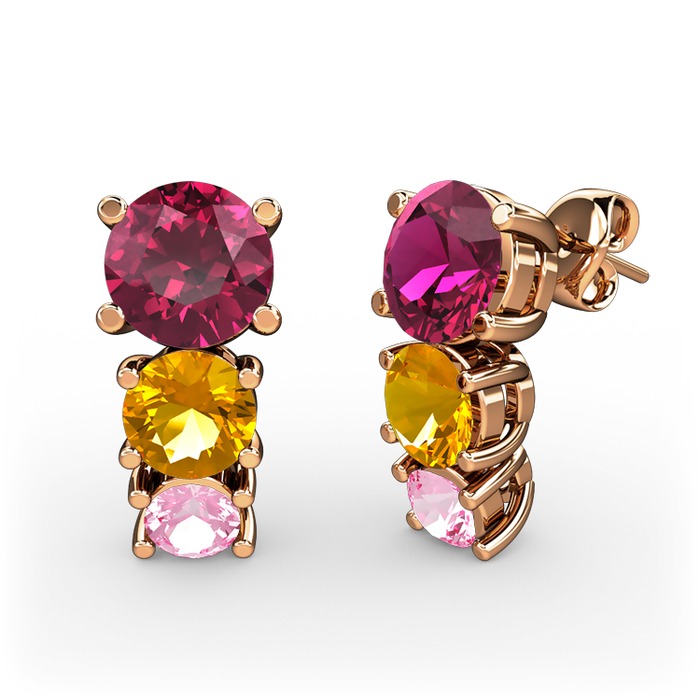 Rodolit garnet, sitrin ve pembe kuvars 18 ayar rose altın küpe
