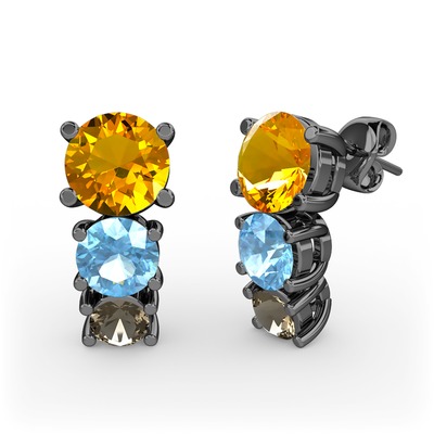 Sitrin, akuamarin ve dumanlı kuvars 925 ayar siyah rodyum kaplama gümüş küpe