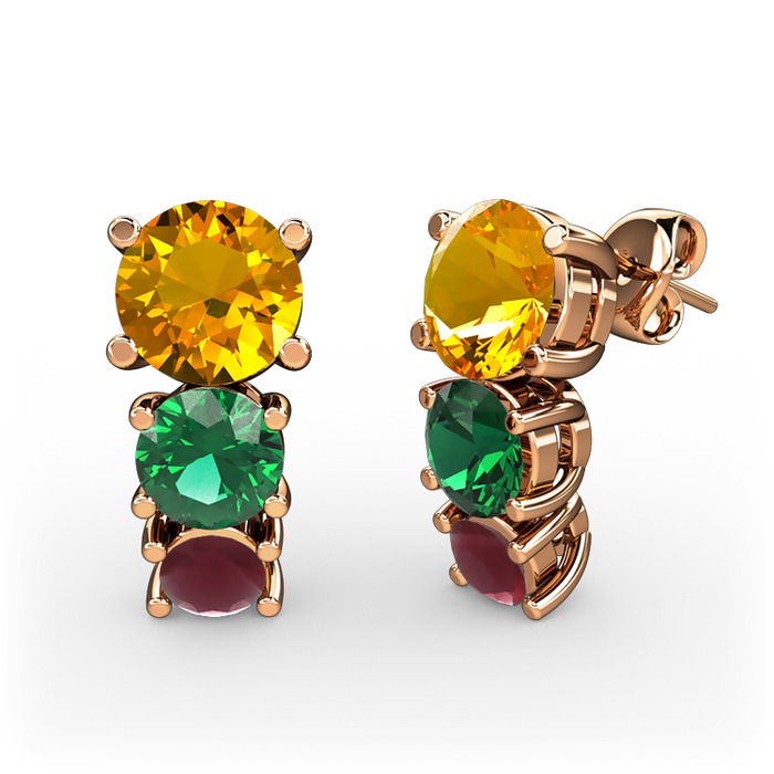 Sitrin, yeşil kuvars ve kök yakut 14 ayar rose altın küpe