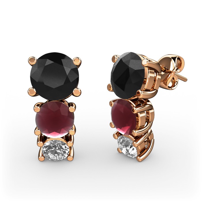Siyah zirkon, kök yakut ve pırlanta 18 ayar rose altın küpe (0.22 karat)