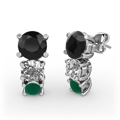 Siyah zirkon, pırlanta ve kök zümrüt 8 ayar beyaz altın küpe (0.48 karat)