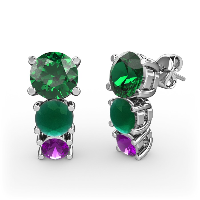 Yeşil kuvars, kök zümrüt ve ametist 18 ayar beyaz altın küpe
