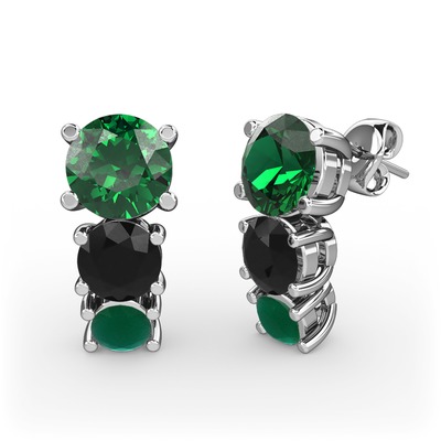 Yeşil kuvars, siyah zirkon ve kök zümrüt 8 ayar beyaz altın küpe