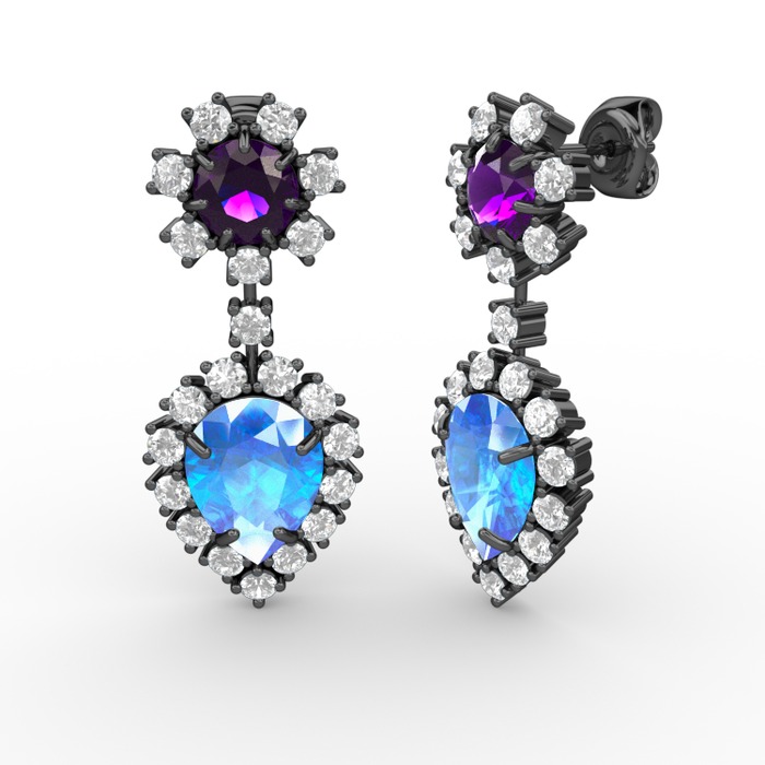 Akuamarin, pırlanta ve ametist 925 ayar siyah rodyum kaplama gümüş küpe (0.792 karat)
