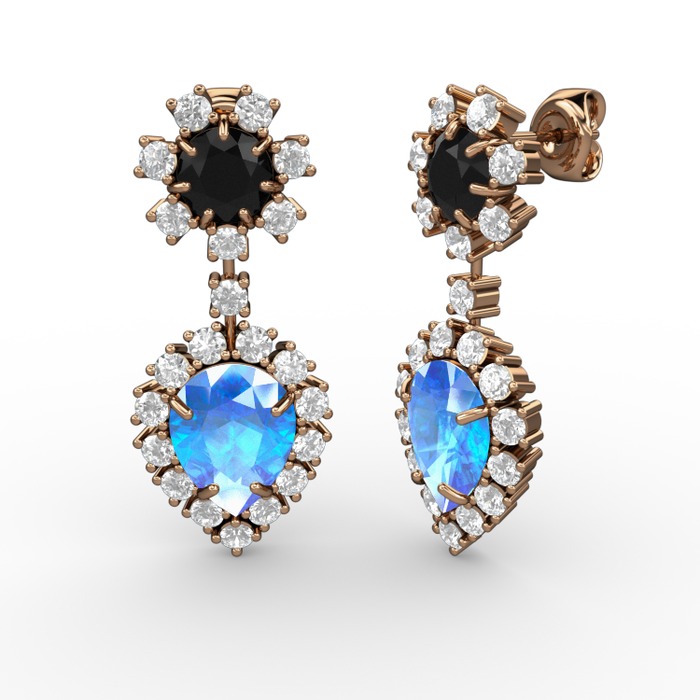 Akuamarin, pırlanta ve siyah zirkon 14 ayar rose altın küpe (0.792 karat)