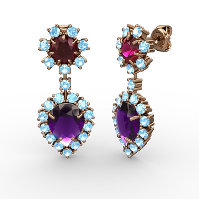 Ametist, akuamarin ve rodolit garnet 14 ayar rose altın küpe