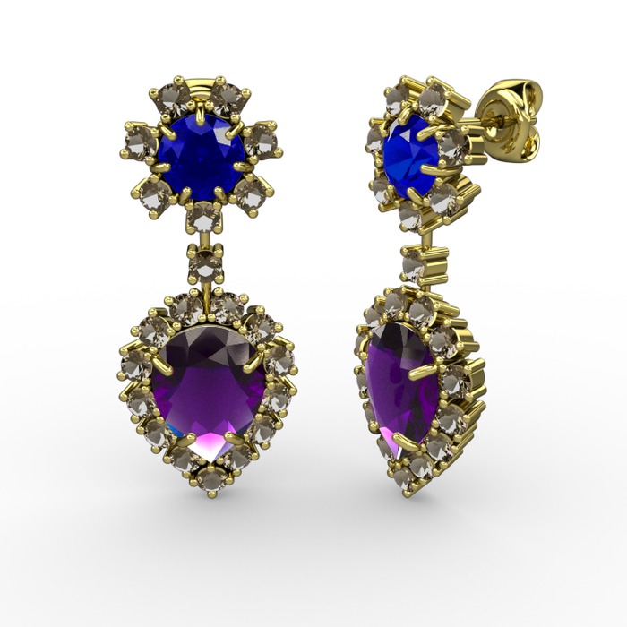 Ametist, dumanlı kuvars ve lab safir 18 ayar altın küpe