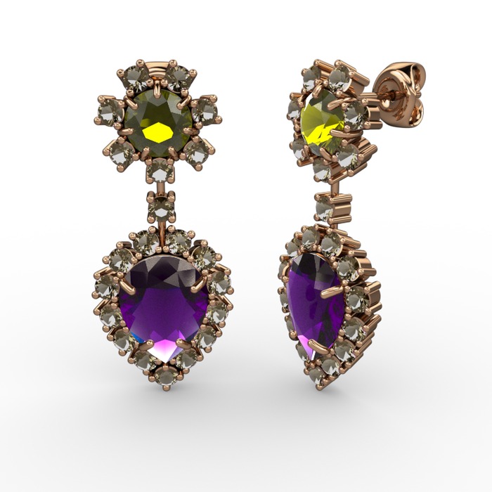Ametist, dumanlı kuvars ve peridot 8 ayar rose altın küpe