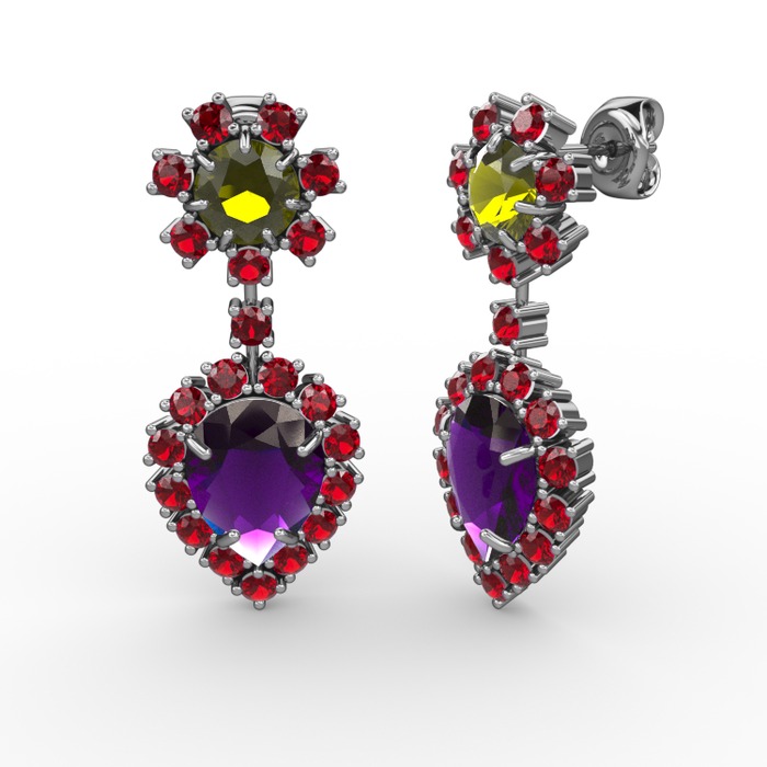 Ametist, garnet ve peridot 18 ayar beyaz altın küpe