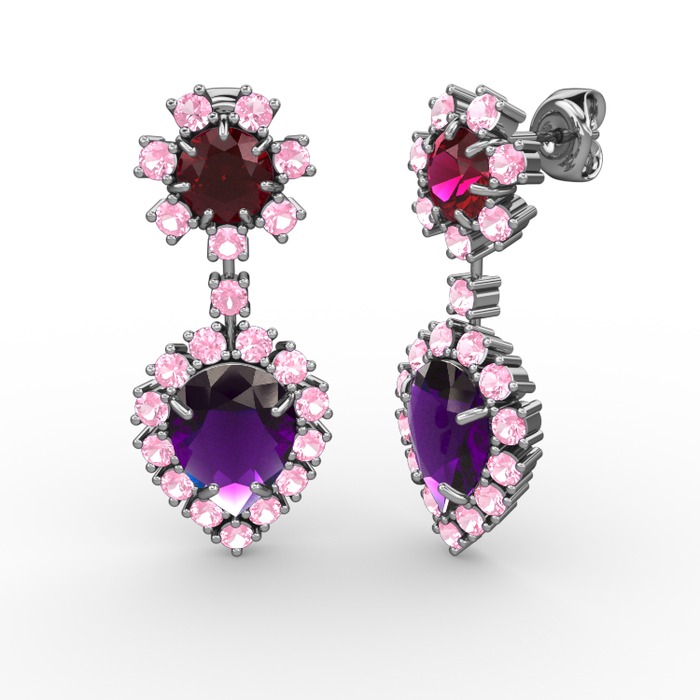 Ametist, pembe kuvars ve rodolit garnet 18 ayar beyaz altın küpe