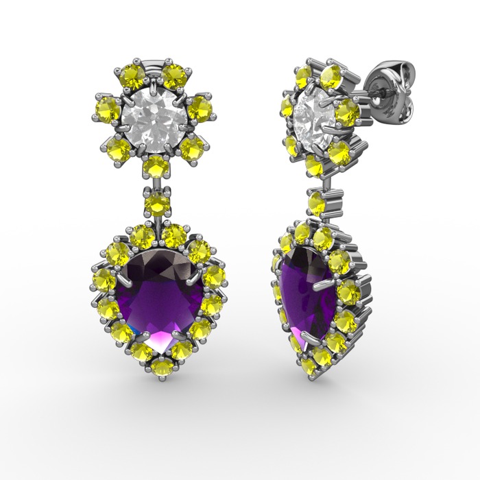 Ametist, peridot ve beyaz zirkon 14 ayar beyaz altın küpe