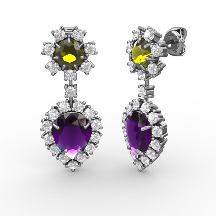 Ametist, pırlanta ve peridot 8 ayar beyaz altın küpe (0.792 karat)