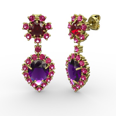 Ametist, rodolit garnet ve garnet 8 ayar altın küpe