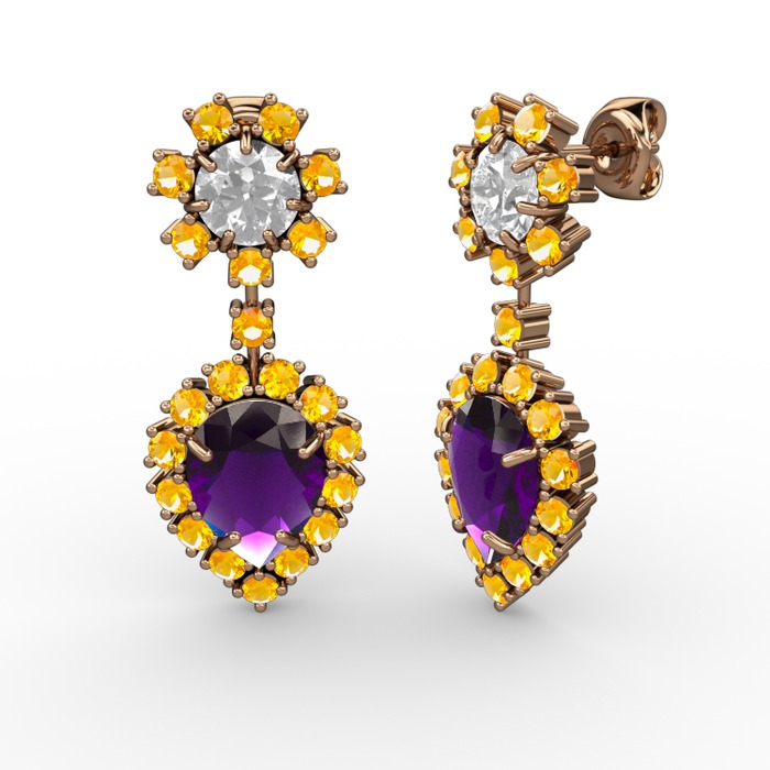 Ametist, sitrin ve beyaz zirkon 8 ayar rose altın küpe