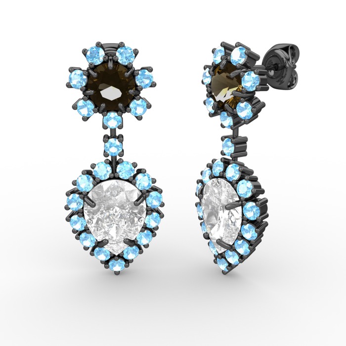 Beyaz zirkon, akuamarin ve dumanlı kuvars 925 ayar siyah rodyum kaplama gümüş küpe