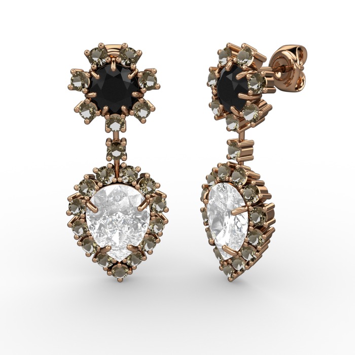 Beyaz zirkon, dumanlı kuvars ve siyah zirkon 925 ayar rose altın kaplama gümüş küpe