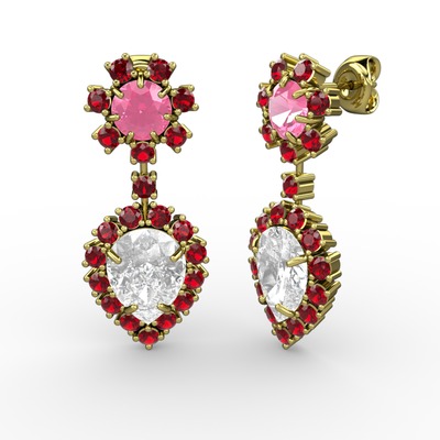 Beyaz zirkon, garnet ve pembe kuvars 14 ayar altın küpe