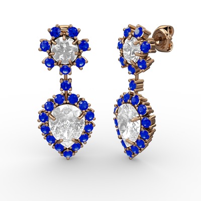 Beyaz zirkon ve lab safir 925 ayar rose altın kaplama gümüş küpe