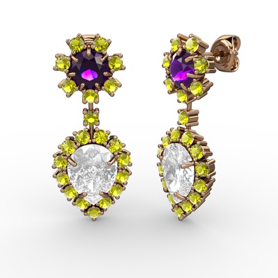 Beyaz zirkon, peridot ve ametist 925 ayar rose altın kaplama gümüş küpe