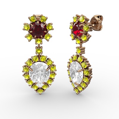 Beyaz zirkon, peridot ve garnet 925 ayar rose altın kaplama gümüş küpe