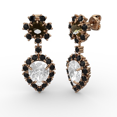 Beyaz zirkon, siyah zirkon ve dumanlı kuvars 14 ayar rose altın küpe