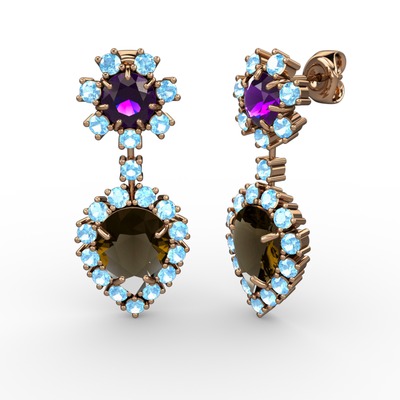 Dumanlı kuvars, akuamarin ve ametist 18 ayar rose altın küpe