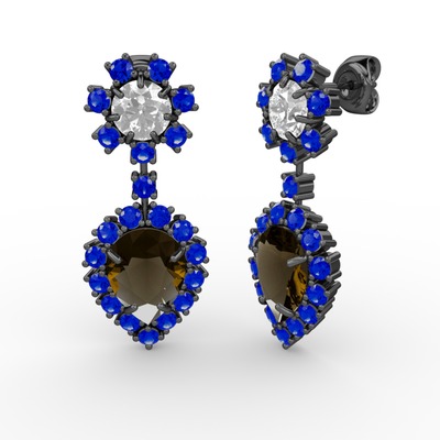 Dumanlı kuvars, lab safir ve beyaz zirkon 925 ayar siyah rodyum kaplama gümüş küpe