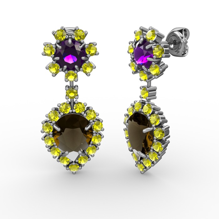 Dumanlı kuvars, peridot ve ametist 8 ayar beyaz altın küpe
