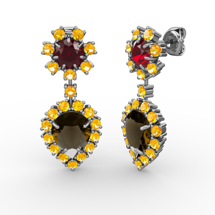 Dumanlı kuvars, sitrin ve garnet 14 ayar beyaz altın küpe