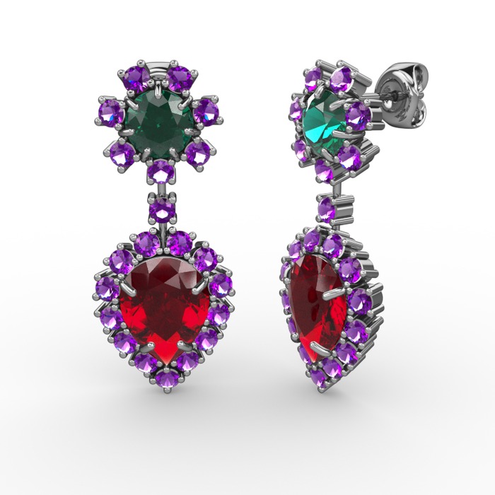 Garnet, ametist ve yeşil kuvars 14 ayar beyaz altın küpe
