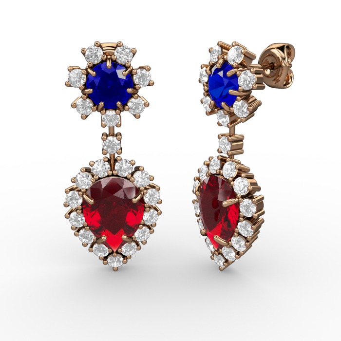 Garnet, pırlanta ve lab safir 8 ayar rose altın küpe (0.792 karat)