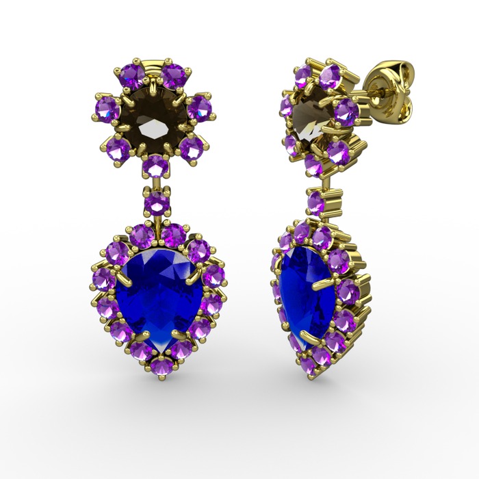 Lab safir, ametist ve dumanlı kuvars 8 ayar altın küpe