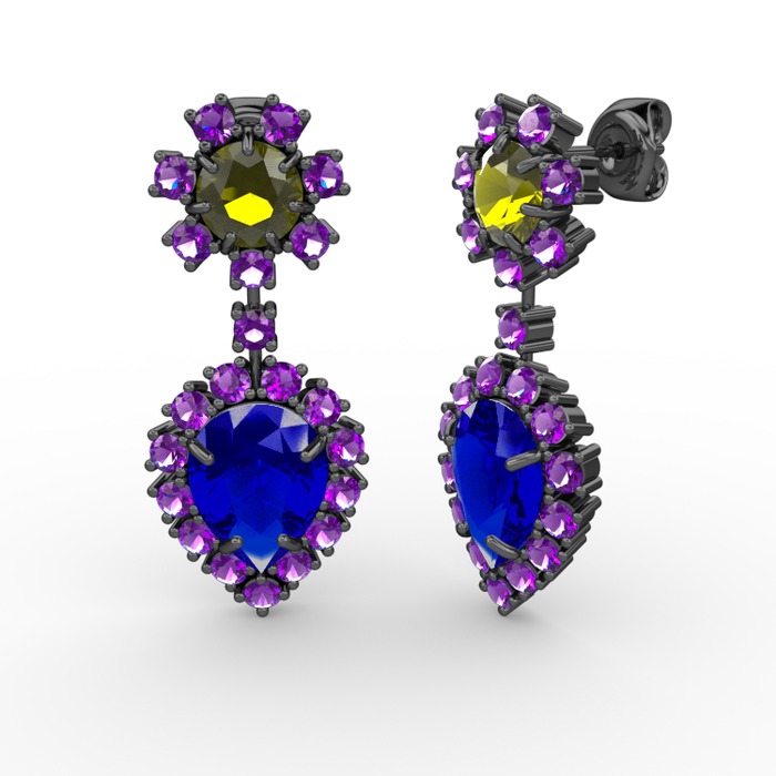 Lab safir, ametist ve peridot 925 ayar siyah rodyum kaplama gümüş küpe