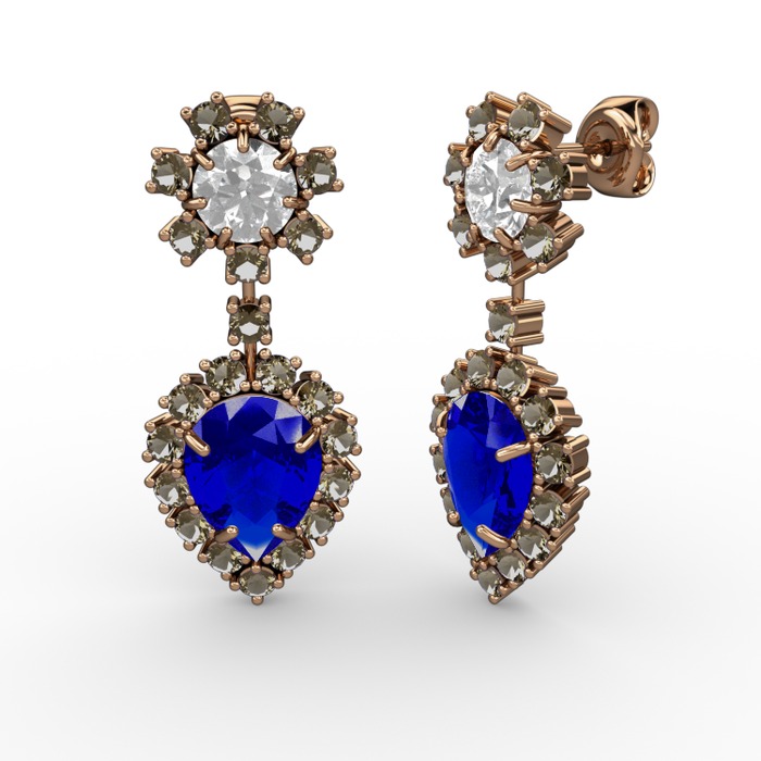 Lab safir, dumanlı kuvars ve beyaz zirkon 14 ayar rose altın küpe