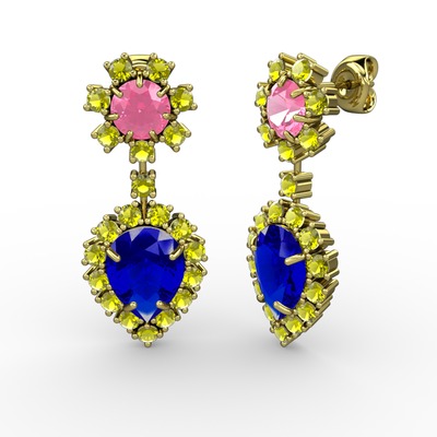 Lab safir, peridot ve pembe kuvars 18 ayar altın küpe