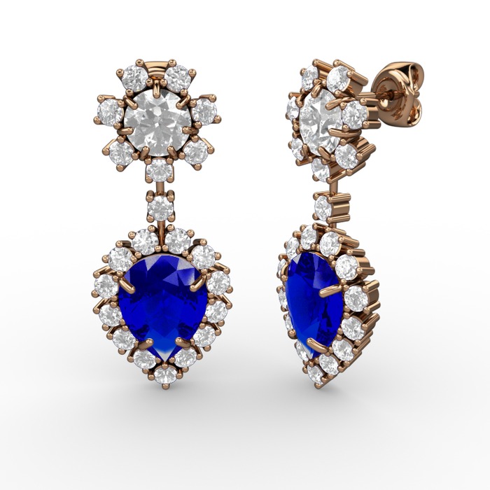 Lab safir, pırlanta ve beyaz zirkon 14 ayar rose altın küpe (0.792 karat)
