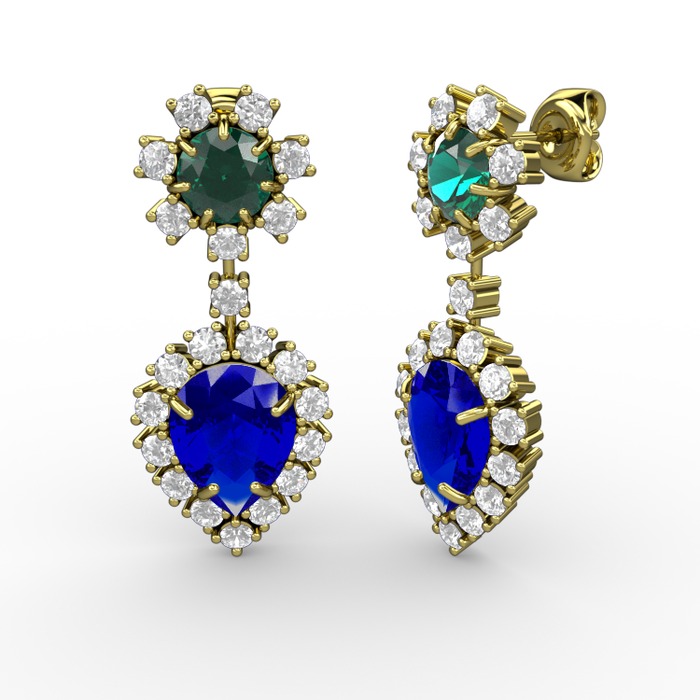 Lab safir, pırlanta ve yeşil kuvars 14 ayar altın küpe (0.792 karat)