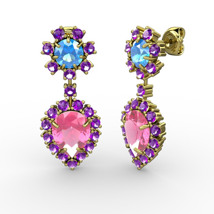 Pembe kuvars, ametist ve akuamarin 14 ayar altın küpe