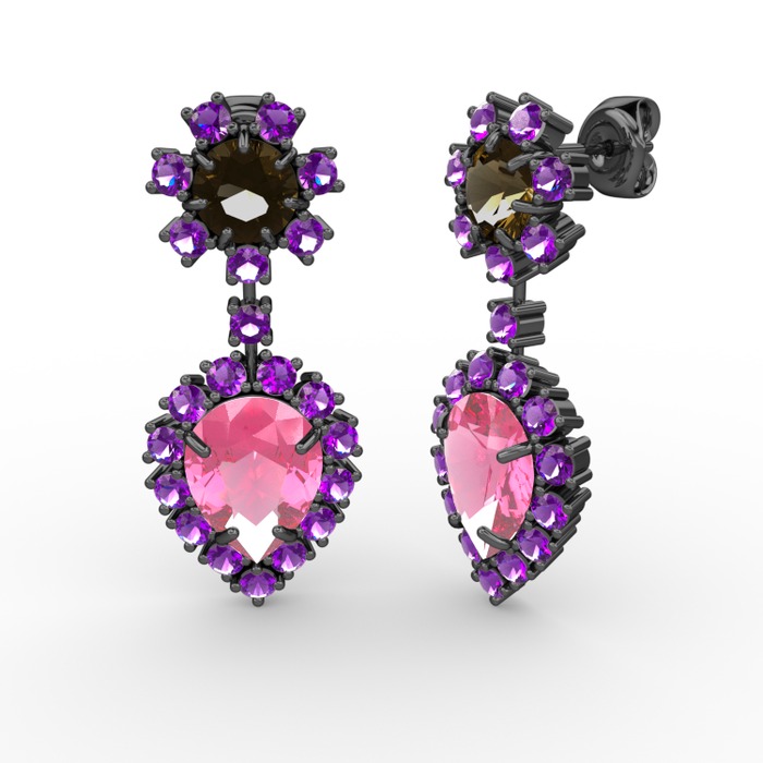 Pembe kuvars, ametist ve dumanlı kuvars 925 ayar siyah rodyum kaplama gümüş küpe