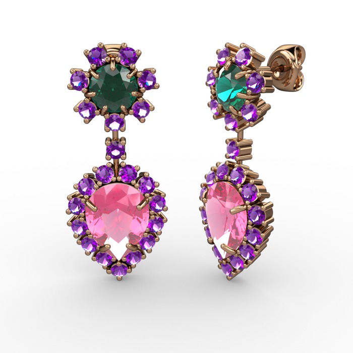 Pembe kuvars, ametist ve yeşil kuvars 8 ayar rose altın küpe
