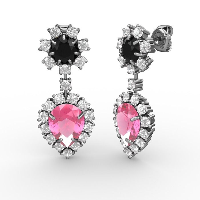 Pembe kuvars, pırlanta ve siyah zirkon 18 ayar beyaz altın küpe (0.792 karat)
