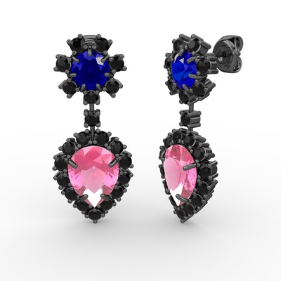 Pembe kuvars, siyah zirkon ve lab safir 925 ayar siyah rodyum kaplama gümüş küpe