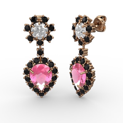 Pembe kuvars, siyah zirkon ve swarovski 14 ayar rose altın küpe