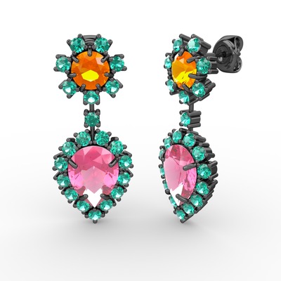 Pembe kuvars, yeşil kuvars ve sitrin 925 ayar siyah rodyum kaplama gümüş küpe