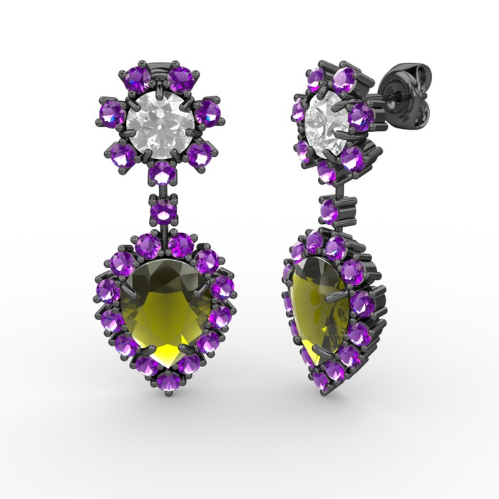 Peridot, ametist ve beyaz zirkon 925 ayar siyah rodyum kaplama gümüş küpe